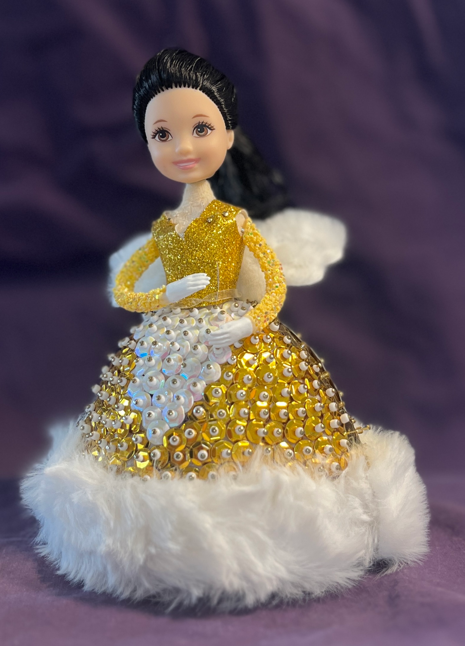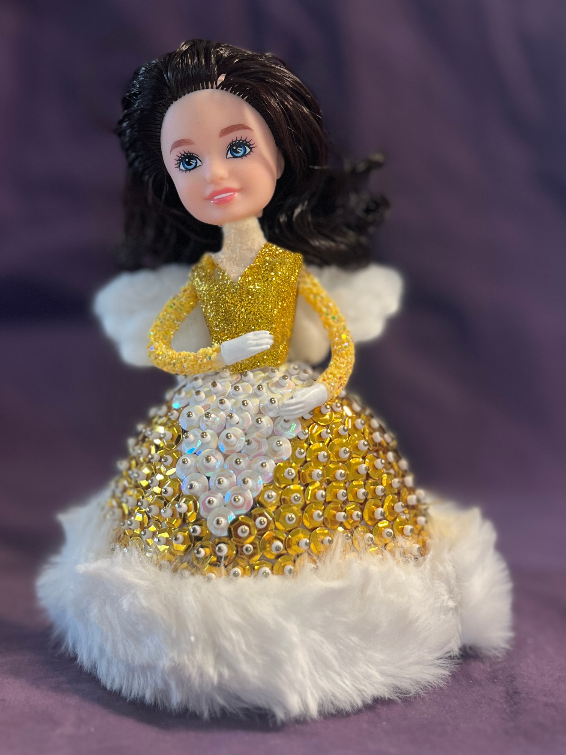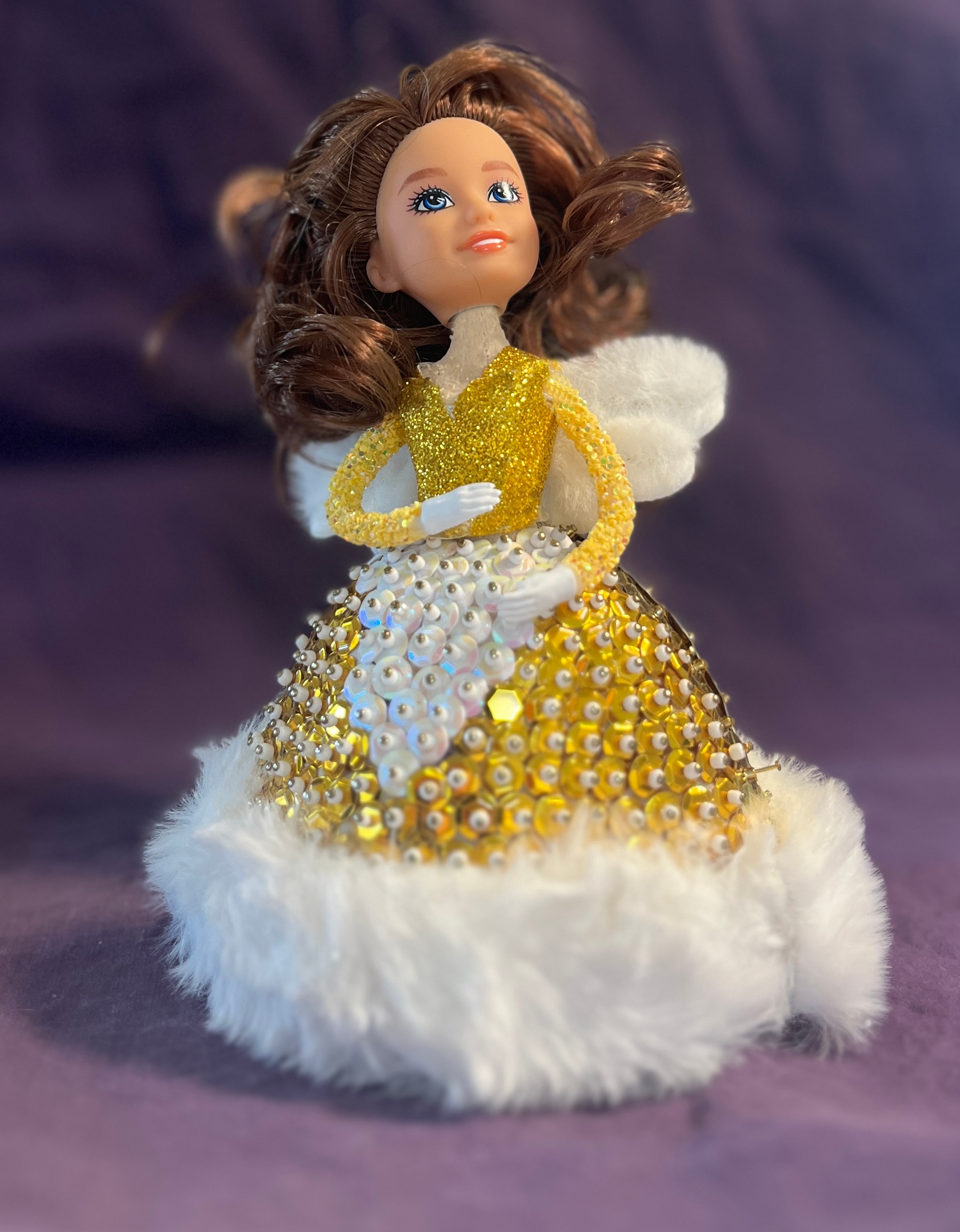 Assembling Angelina is a labor of love, like baking your grandmother’s famous Christmas cookies but without the flour in your hair. Each gold and white sequin you attach adds to her radiant glow, and the plush fur hem on her gown is so luxurious you might just want to pet it for a while (we won’t judge).