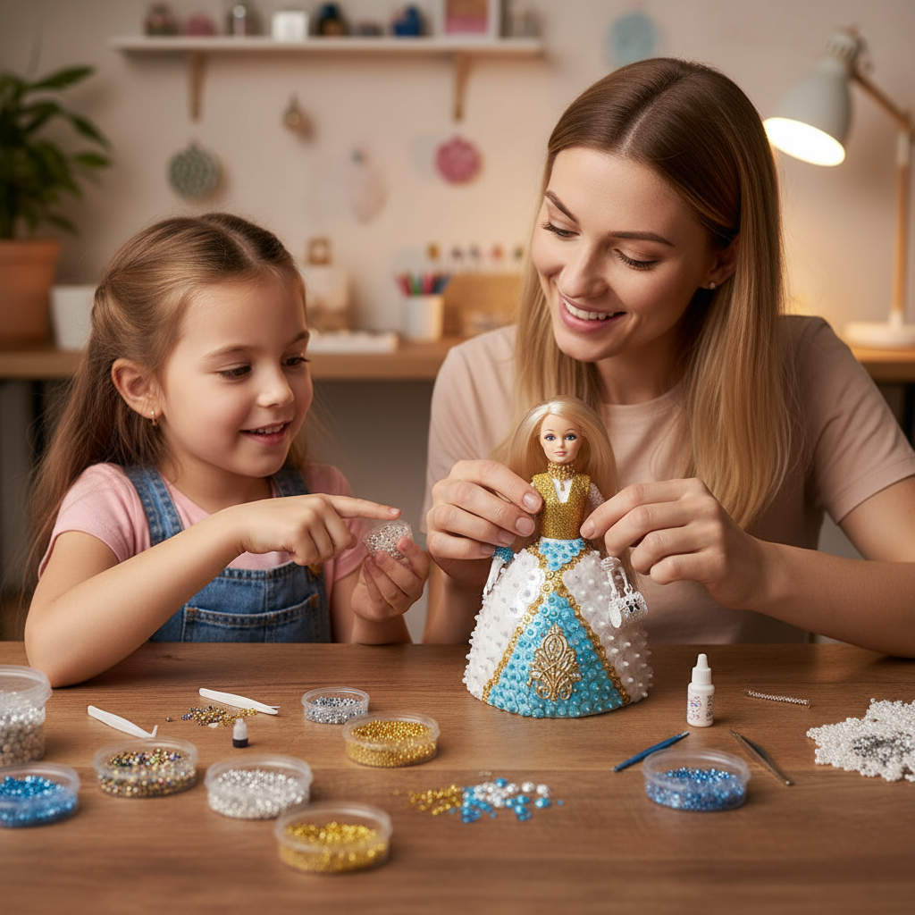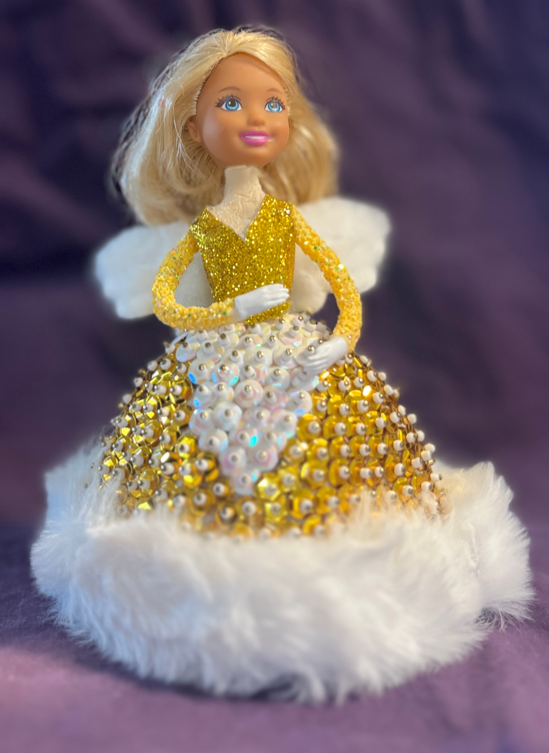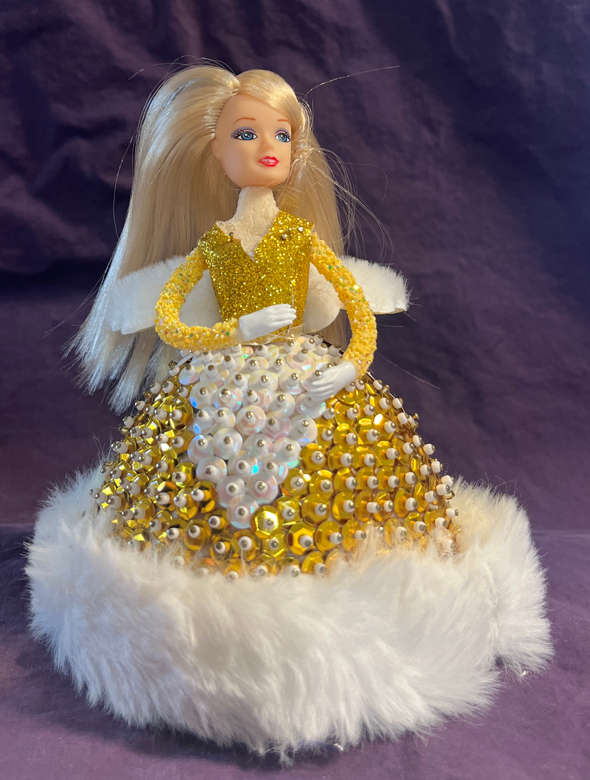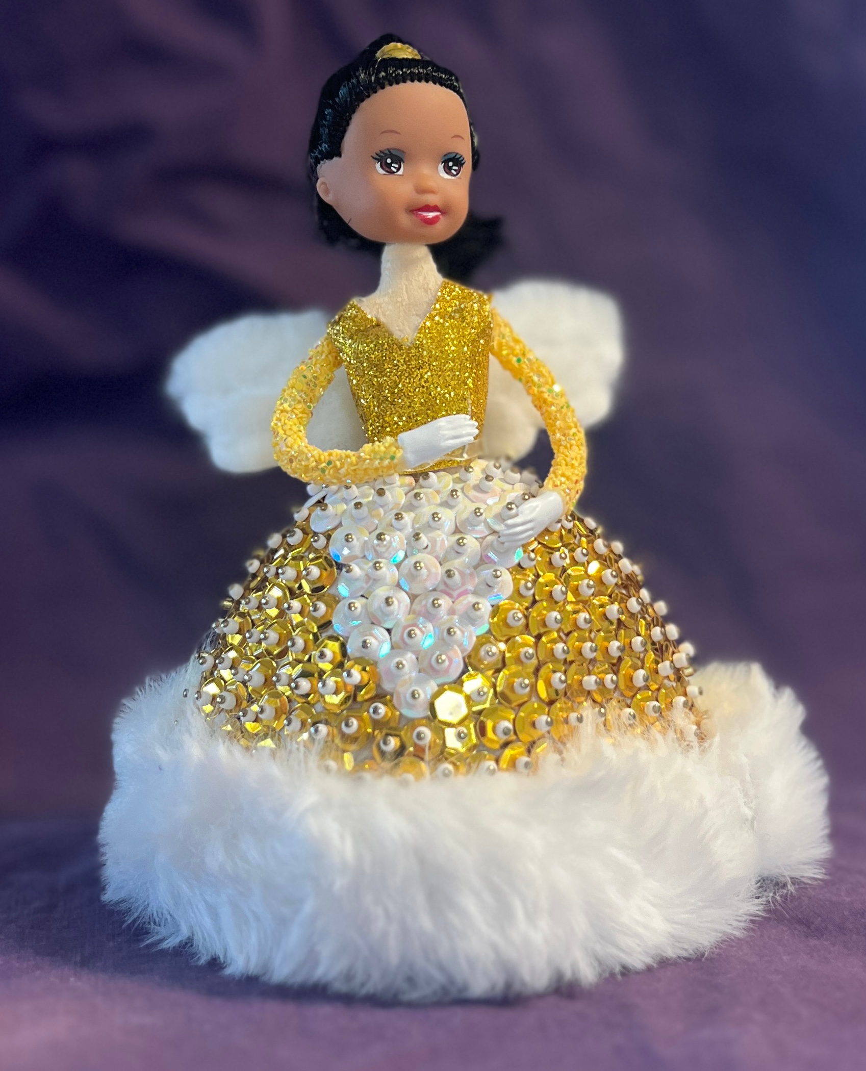 Assembling Angelina is a labor of love, like baking your grandmother’s famous Christmas cookies but without the flour in your hair. Each gold and white sequin you attach adds to her radiant glow, and the plush fur hem on her gown is so luxurious you might just want to pet it for a while (we won’t judge).