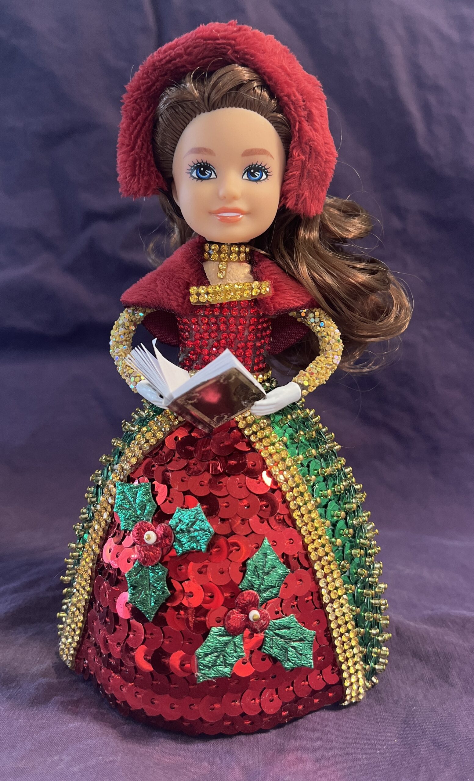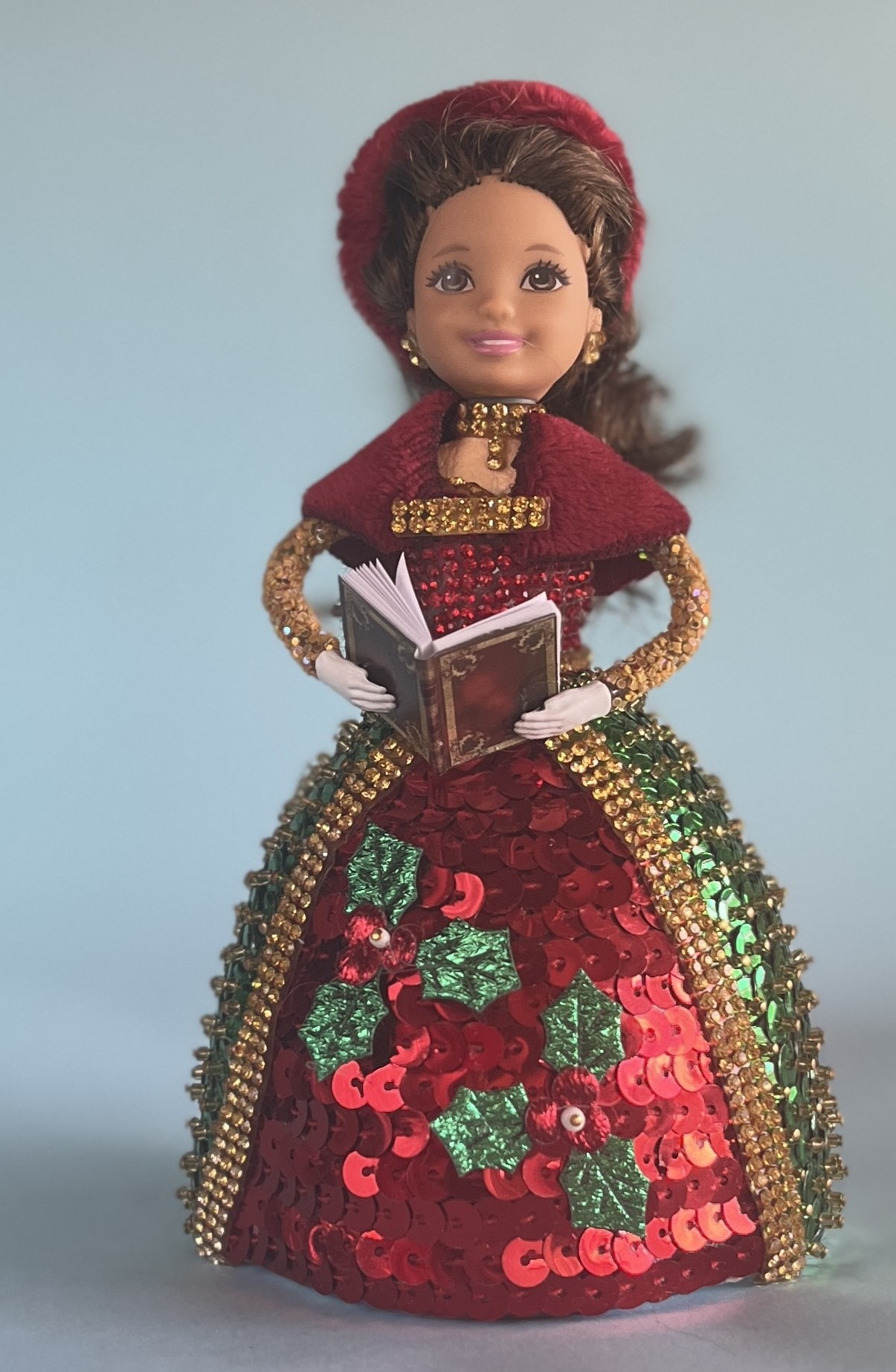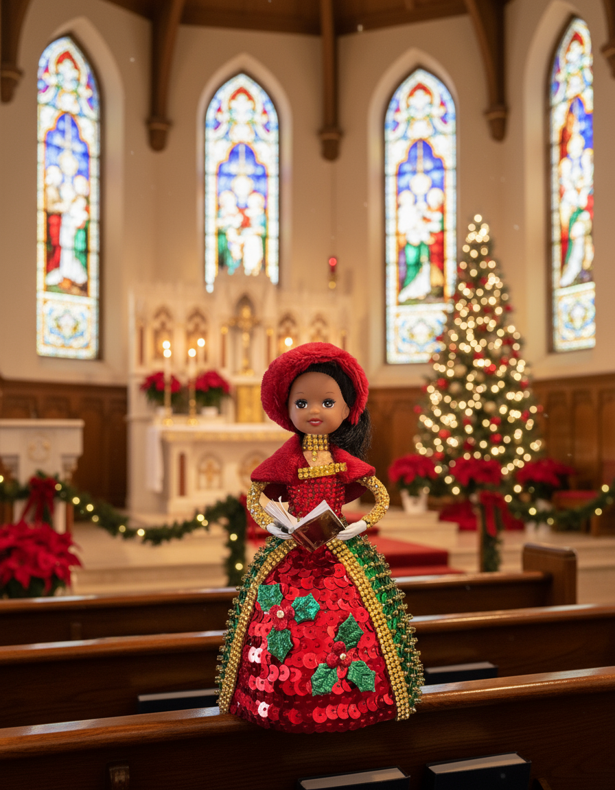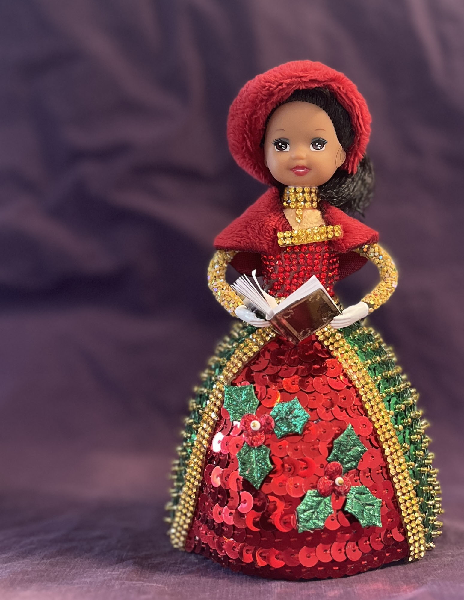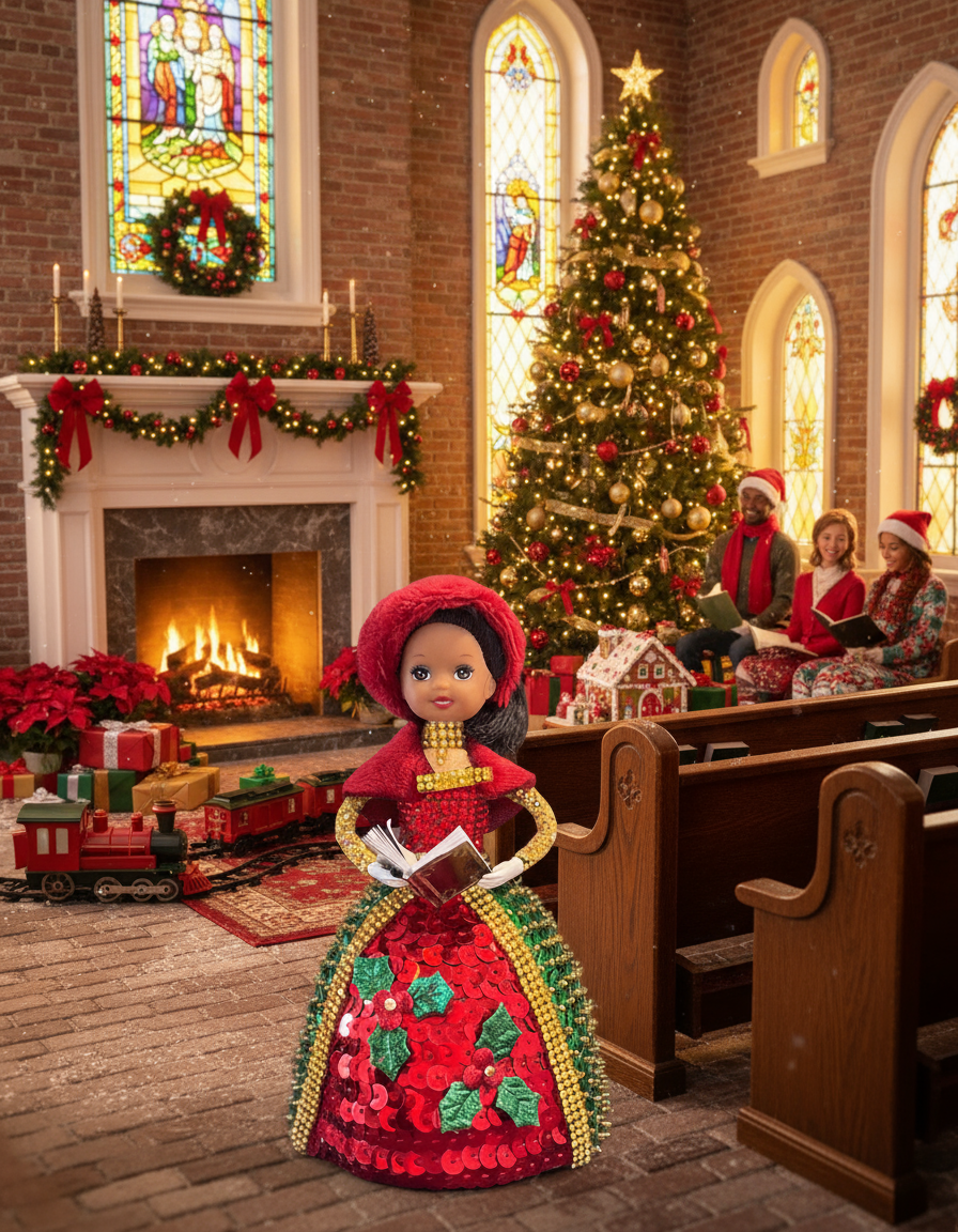 Bring the magic of the holidays to life with Christmas Carole, a Lil Missy Classic doll. Dressed in a vibrant red and green gown adorned with over 600 sparkling sequins and beads, Carole captures the festive spirit of the season. Her elegant ball gown features intricate detailing with gold accents and a touch of shimmering white lace.