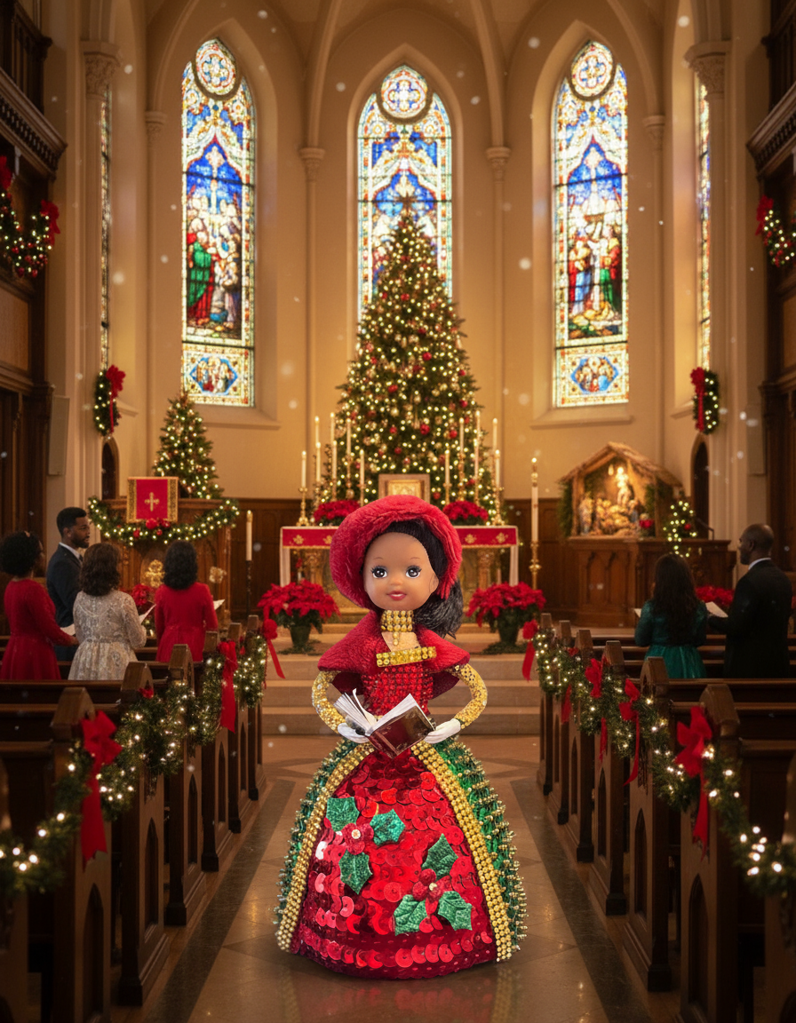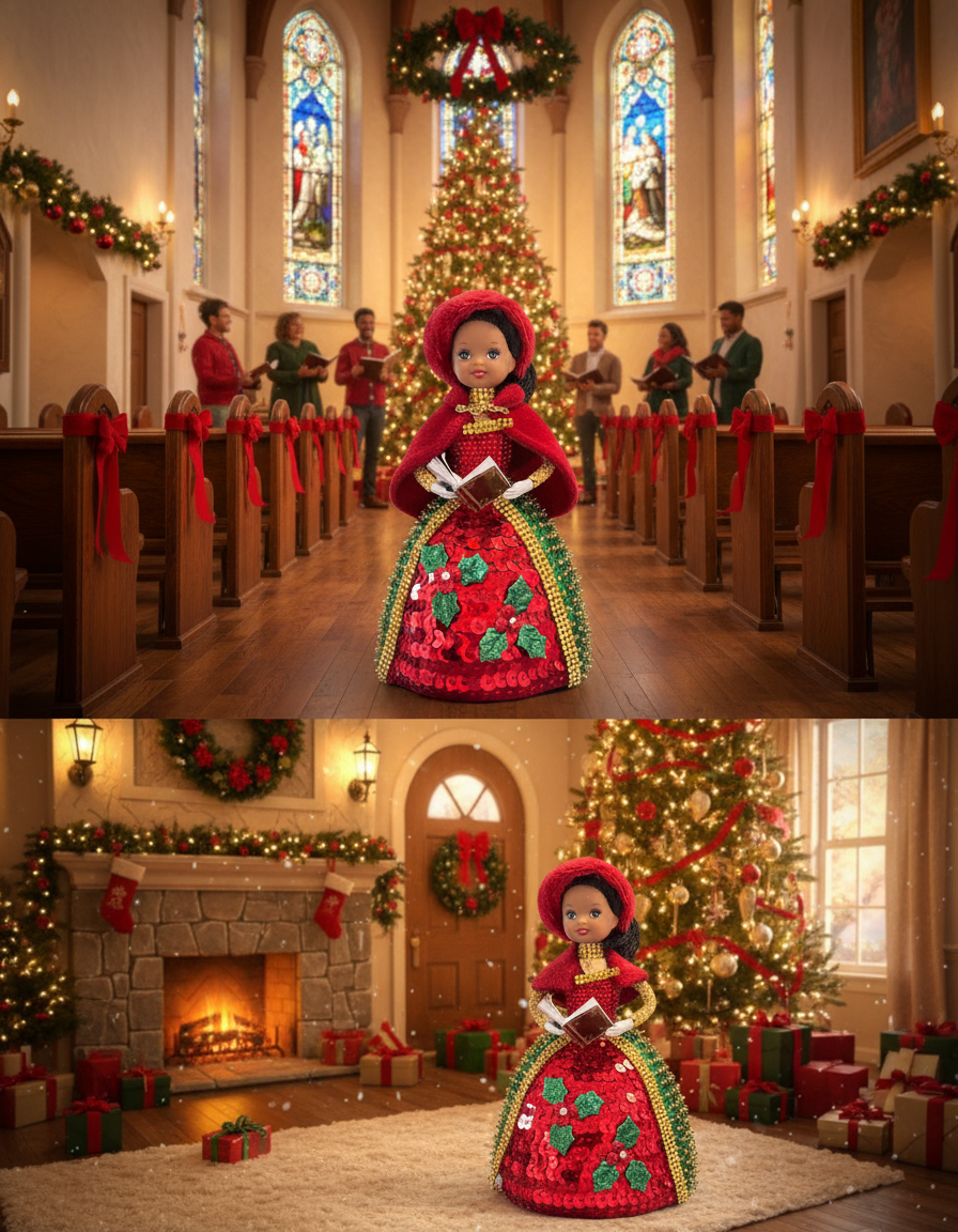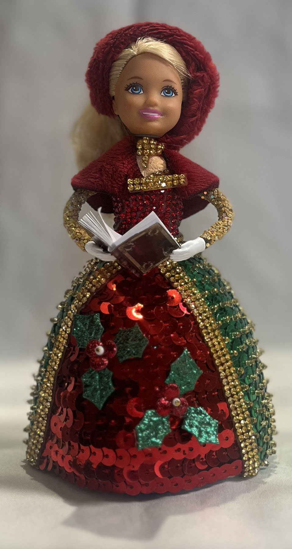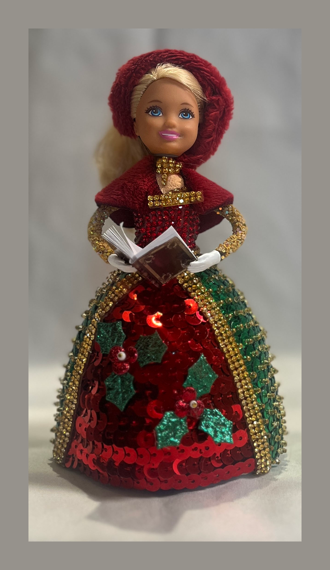 Bring the magic of the holidays to life with Christmas Carole, a Lil Missy Classic doll. Dressed in a vibrant red and green gown adorned with over 600 sparkling sequins and beads, Carole captures the festive spirit of the season. Her elegant ball gown features intricate detailing with gold accents and a touch of shimmering white lace.