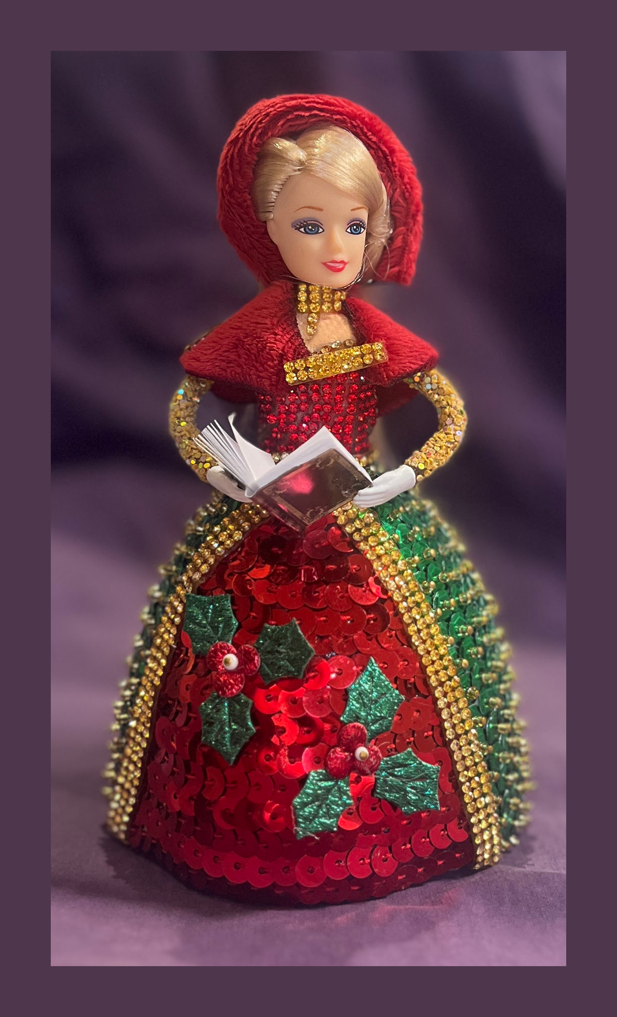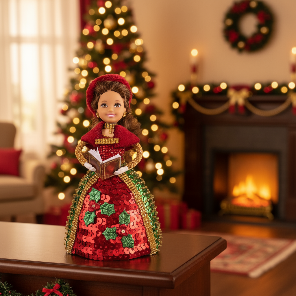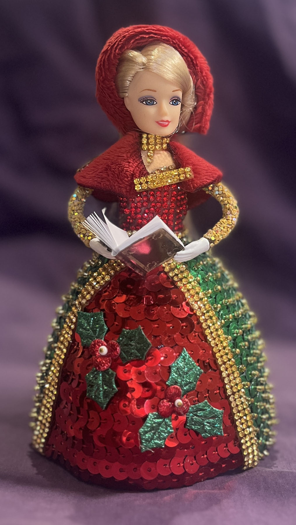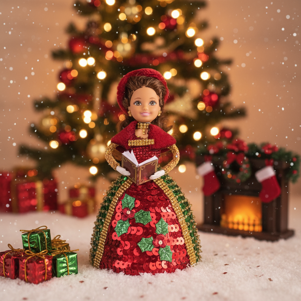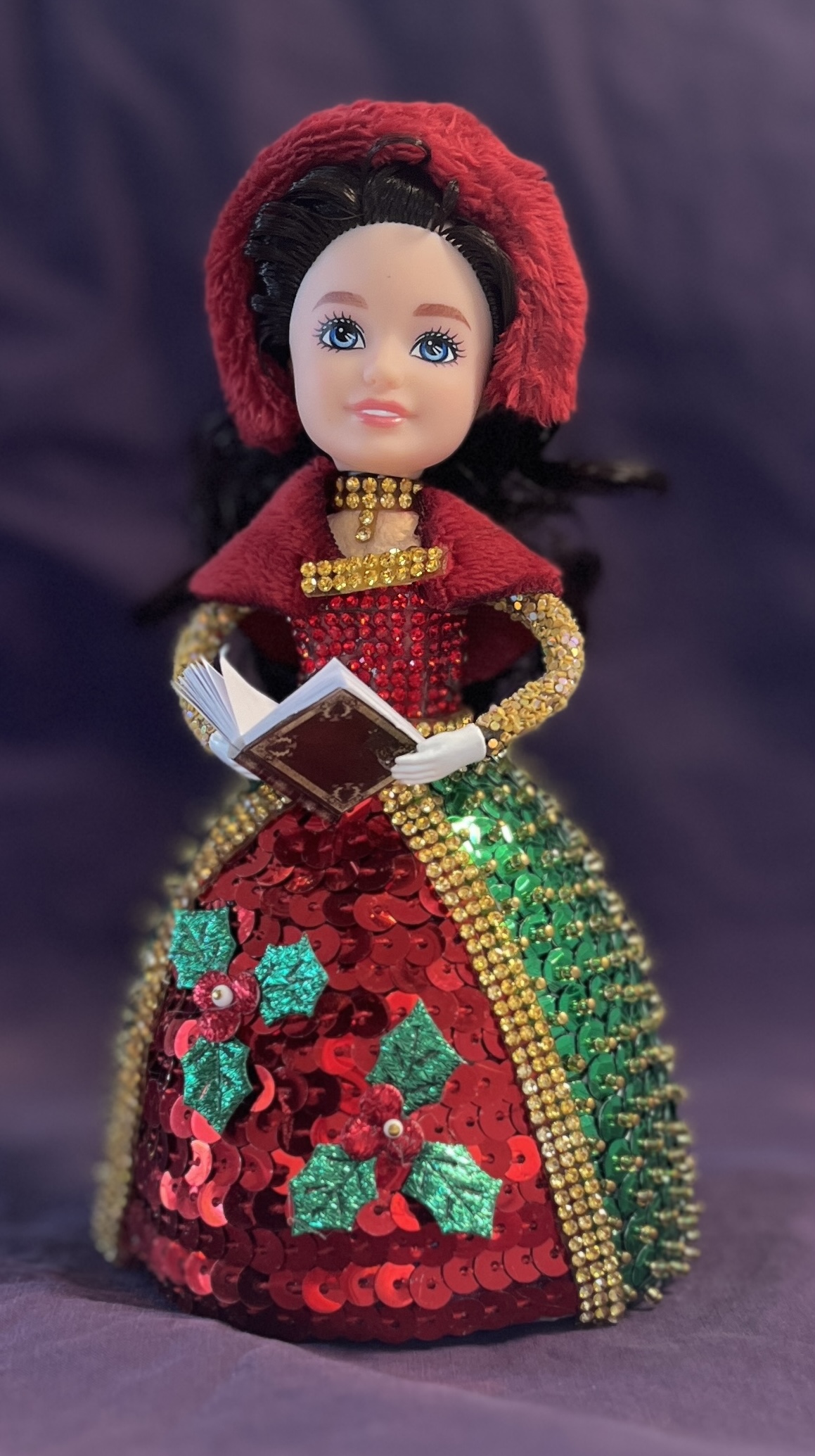 Bring the magic of the holidays to life with Christmas Carole, a Lil Missy Classic doll. Dressed in a vibrant red and green gown adorned with over 600 sparkling sequins and beads, Carole captures the festive spirit of the season. Her elegant ball gown features intricate detailing with gold accents and a touch of shimmering white lace.