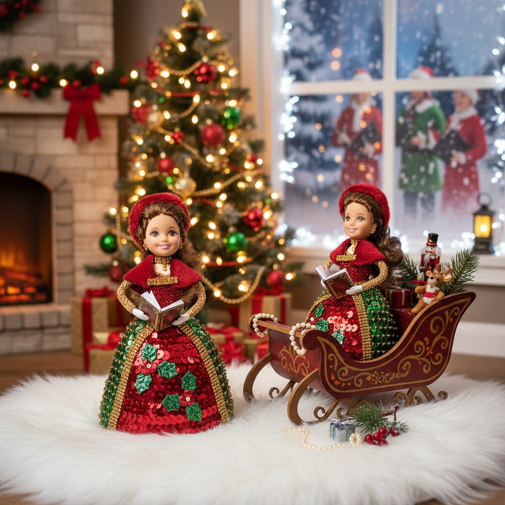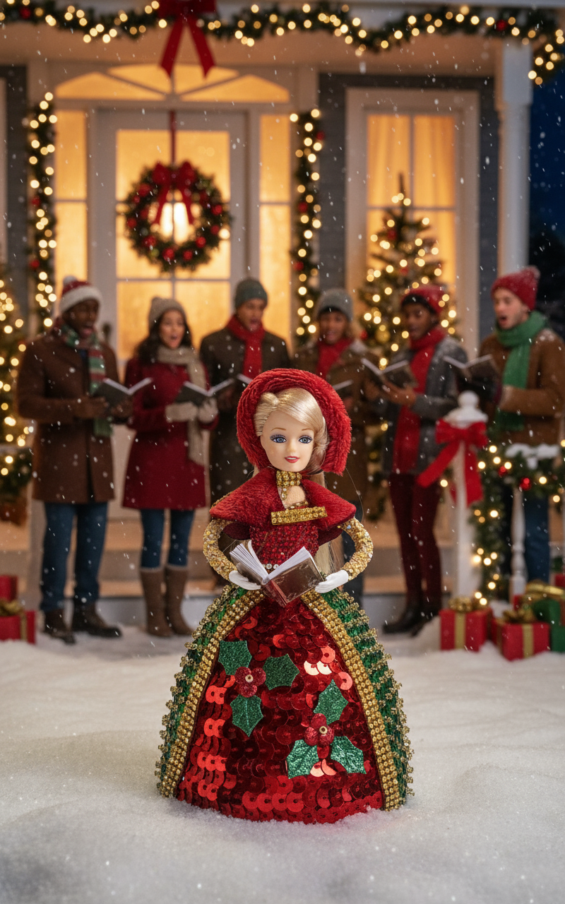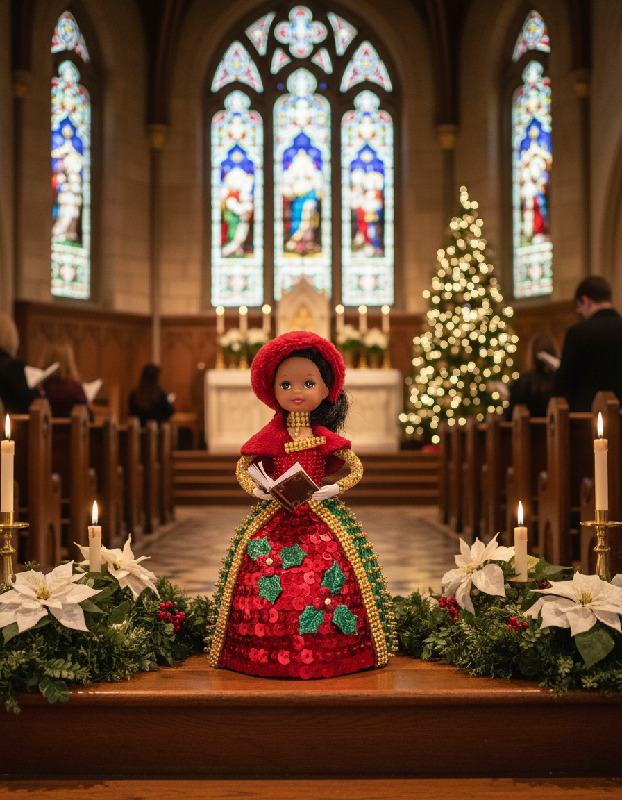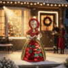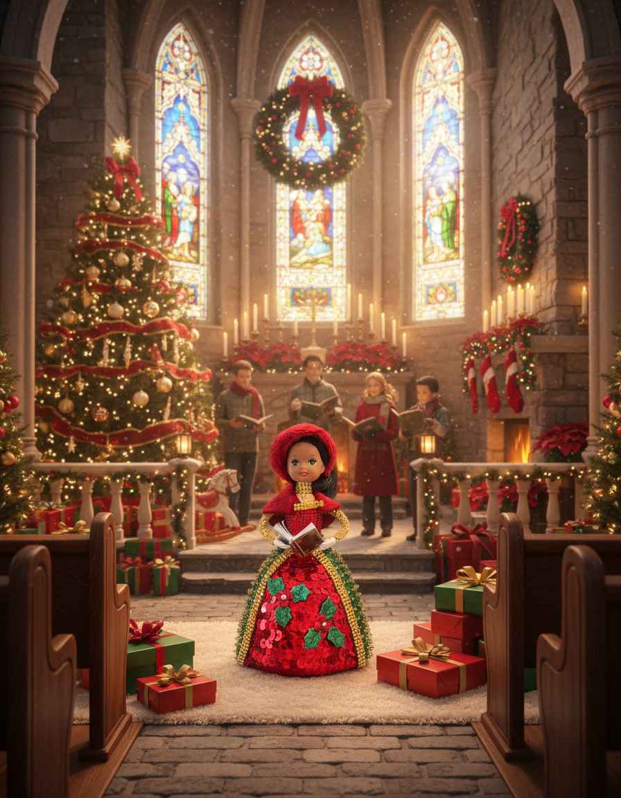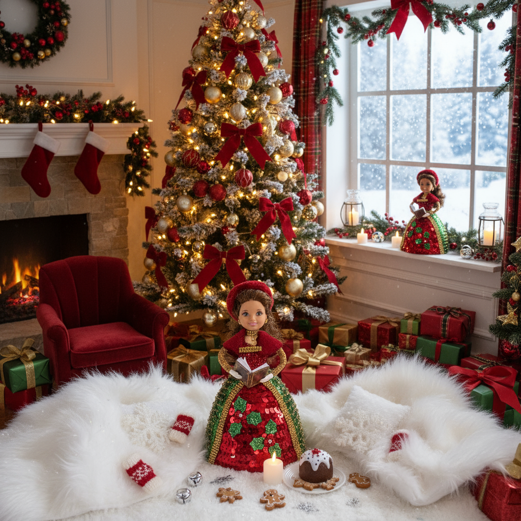 Bring the magic of the holidays to life with Christmas Carole, a Lil Missy Classic doll. Dressed in a vibrant red and green gown adorned with over 600 sparkling sequins and beads, Carole captures the festive spirit of the season. Her elegant ball gown features intricate detailing with gold accents and a touch of shimmering white lace.