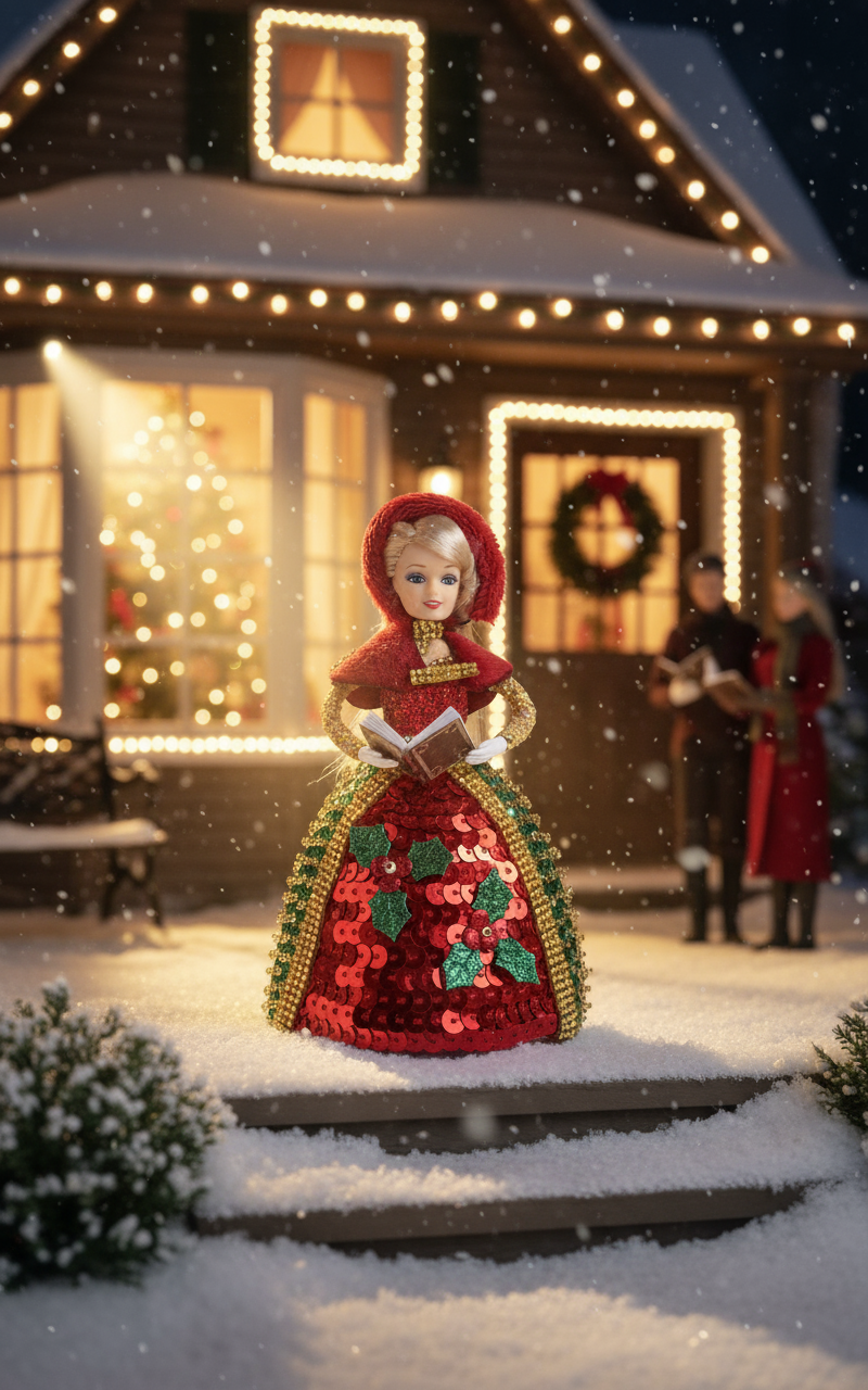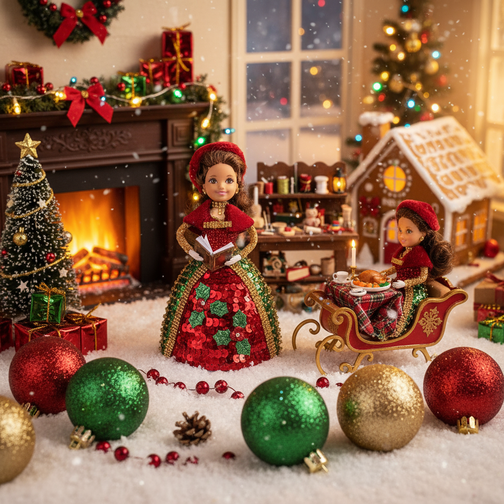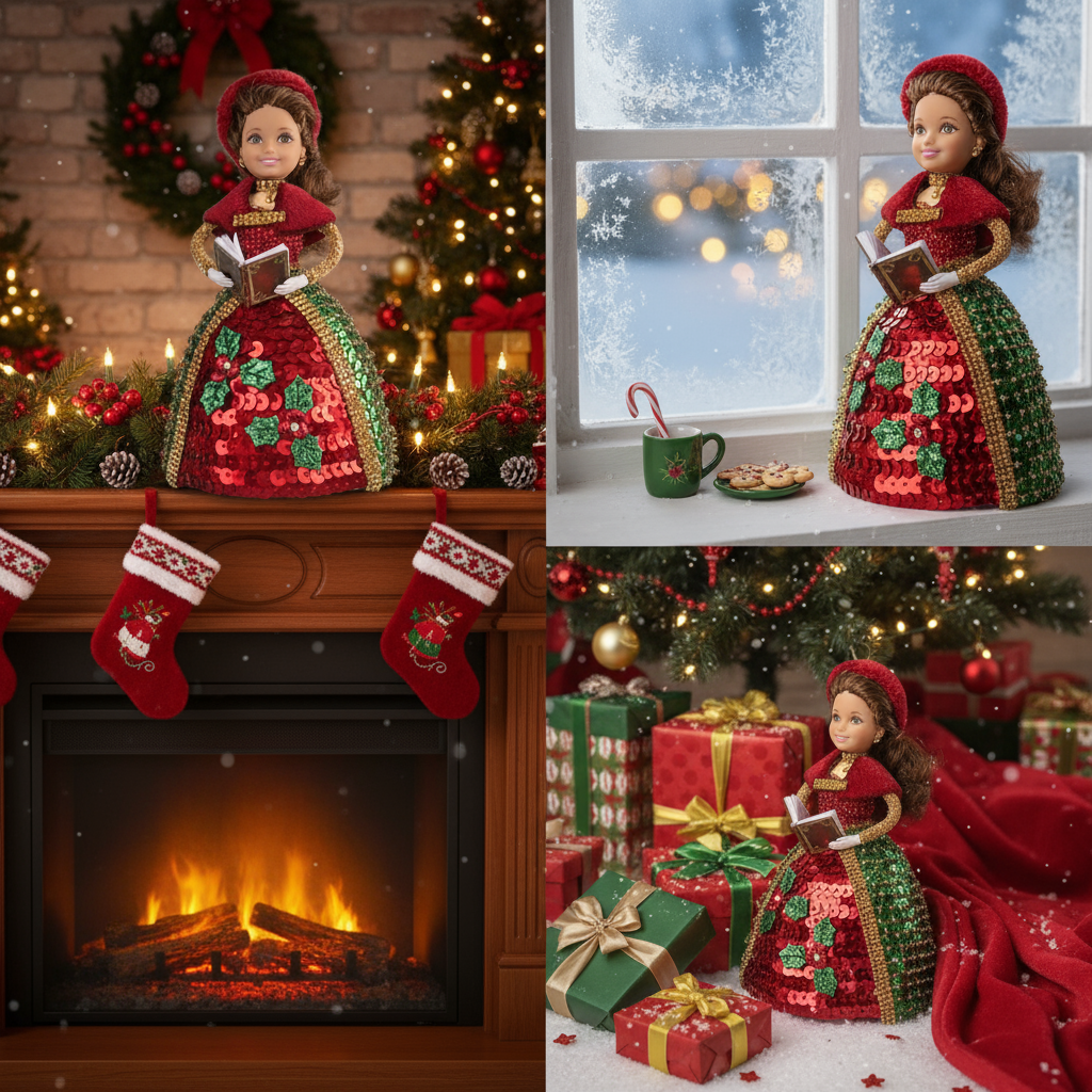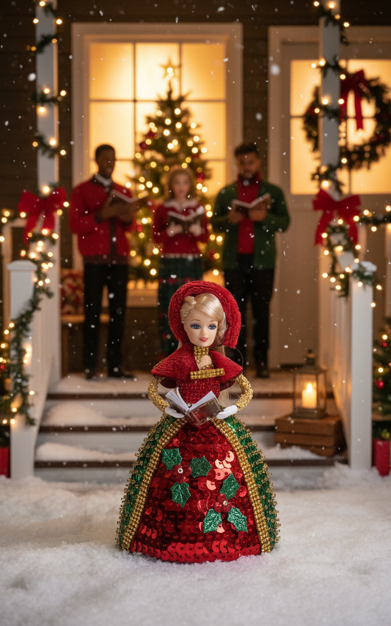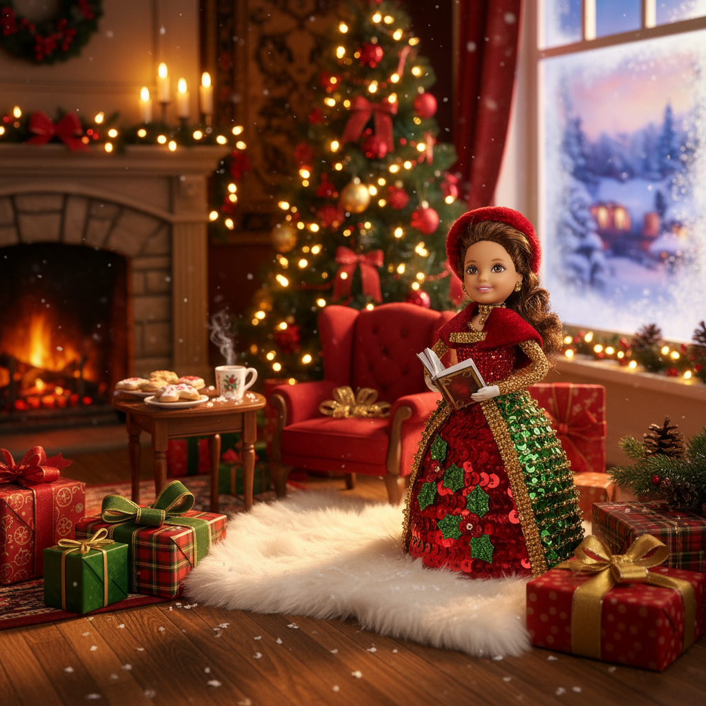 Bring the magic of the holidays to life with Christmas Carole, a Lil Missy Classic doll. Dressed in a vibrant red and green gown adorned with over 600 sparkling sequins and beads, Carole captures the festive spirit of the season. Her elegant ball gown features intricate detailing with gold accents and a touch of shimmering white lace.