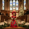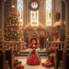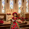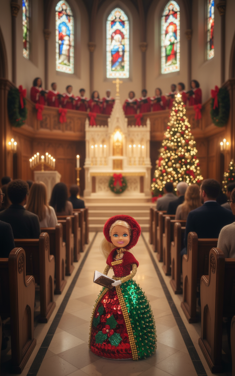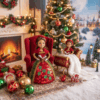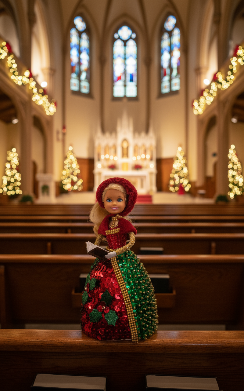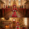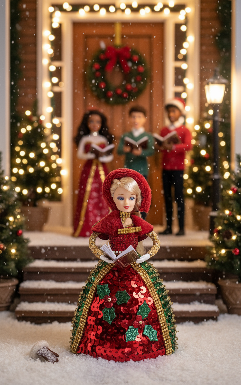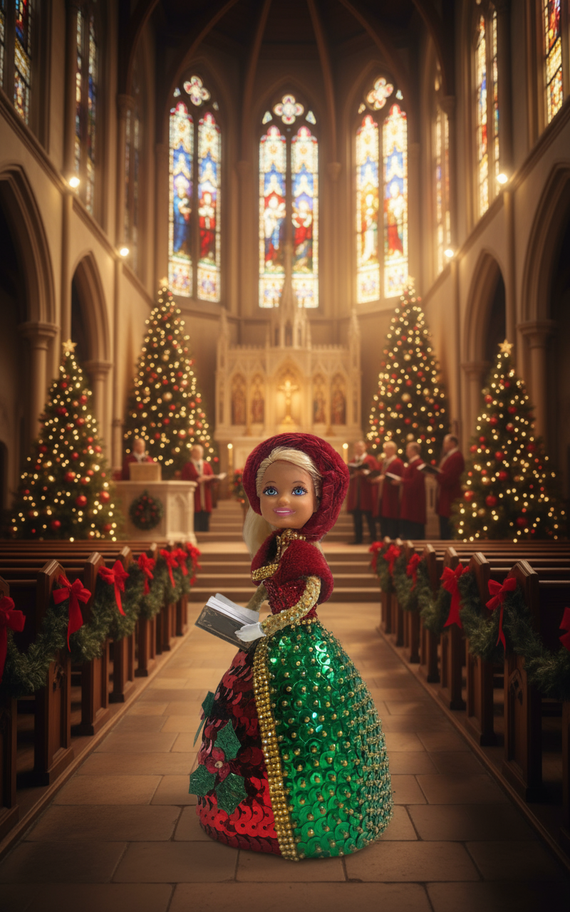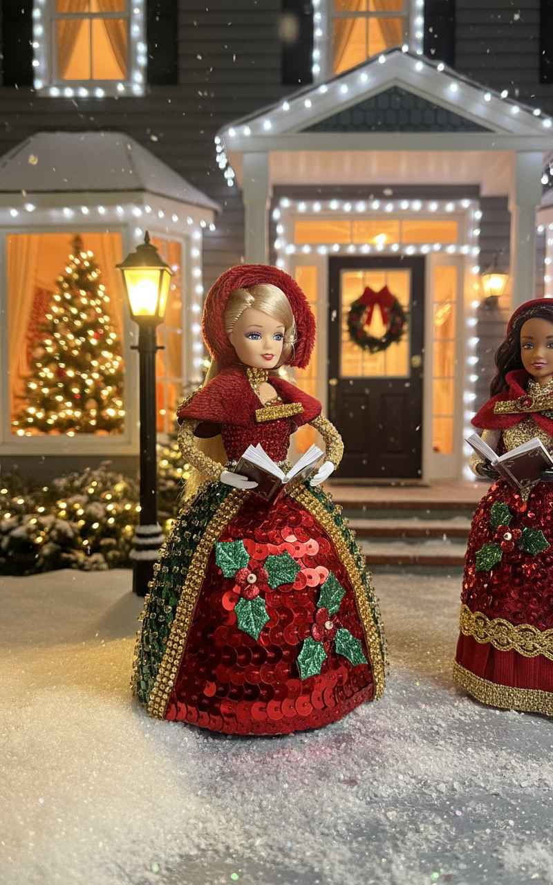 Bring the magic of the holidays to life with Christmas Carole, a Lil Missy Classic doll. Dressed in a vibrant red and green gown adorned with over 600 sparkling sequins and beads, Carole captures the festive spirit of the season. Her elegant ball gown features intricate detailing with gold accents and a touch of shimmering white lace.