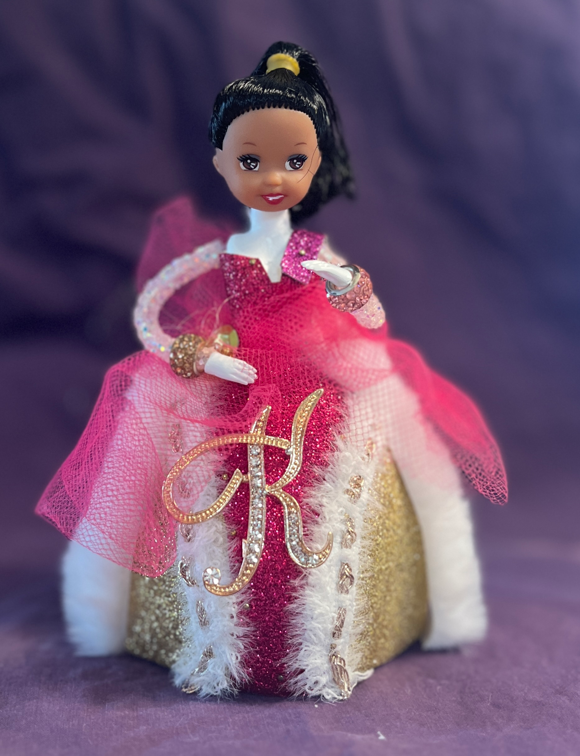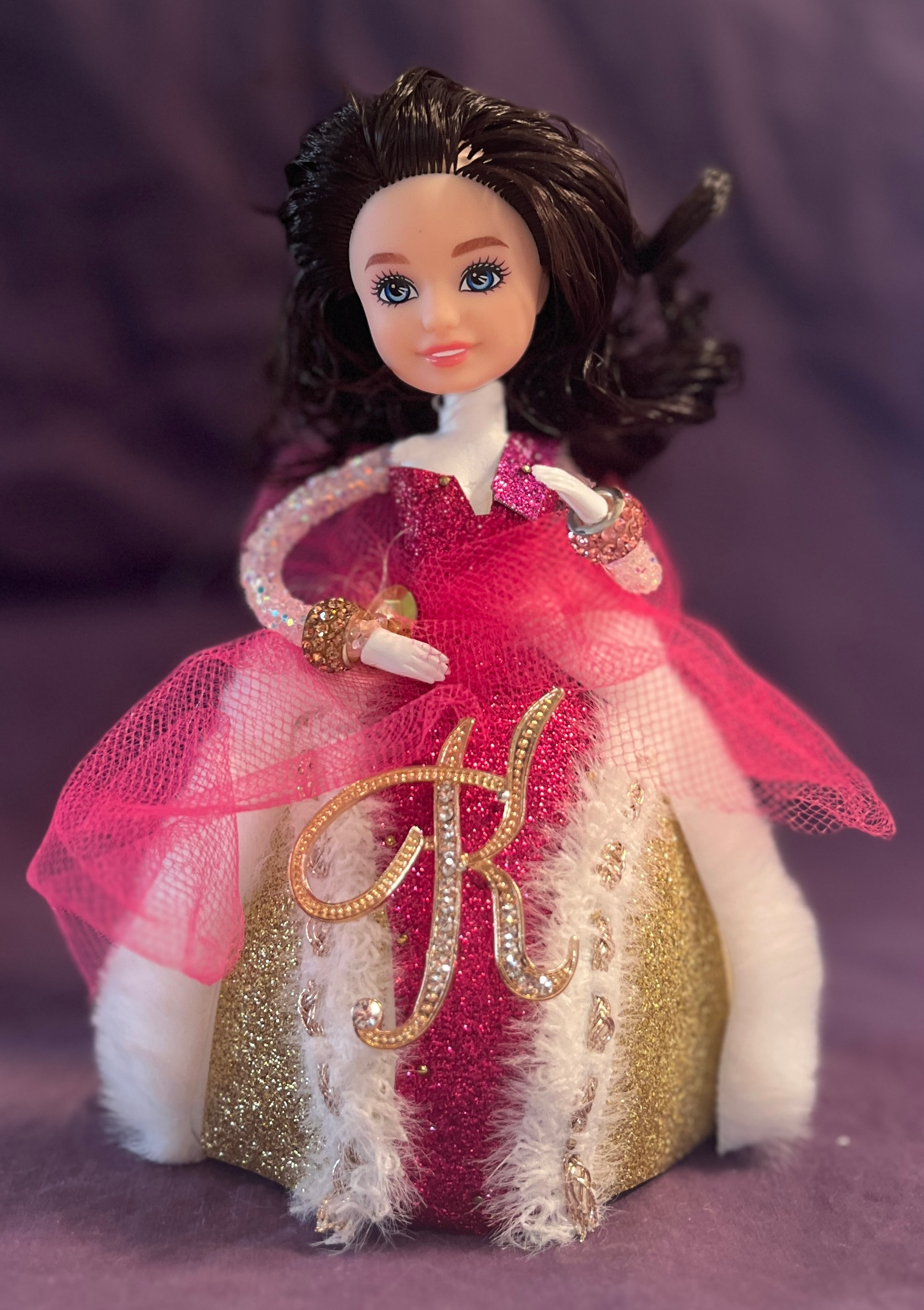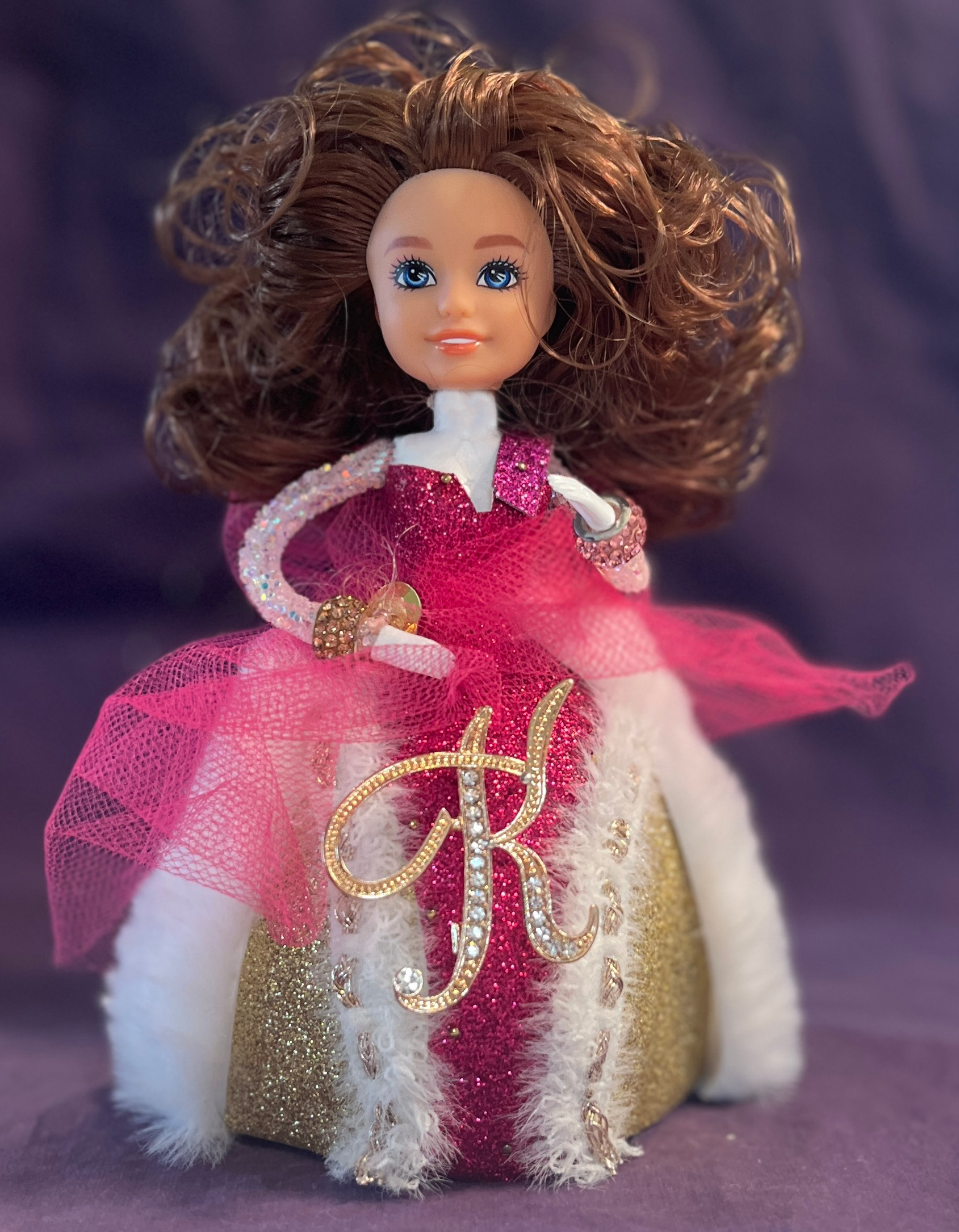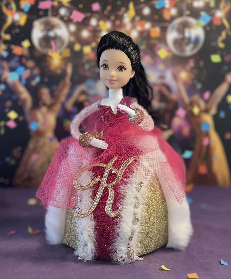 Karina’s outfit is a blend of sophistication and modern flair. She wears a chic, layered skirt made from premium fabrics that shimmer in light pastel tones. The soft, flowing material is accented with delicate sequins and beads, creating a dazzling yet understated look. Her fitted bodice is highlighted with intricate lace detailing, giving her a touch of classic elegance. Customize her with the Monogram of your choice. Pick any letter.