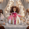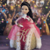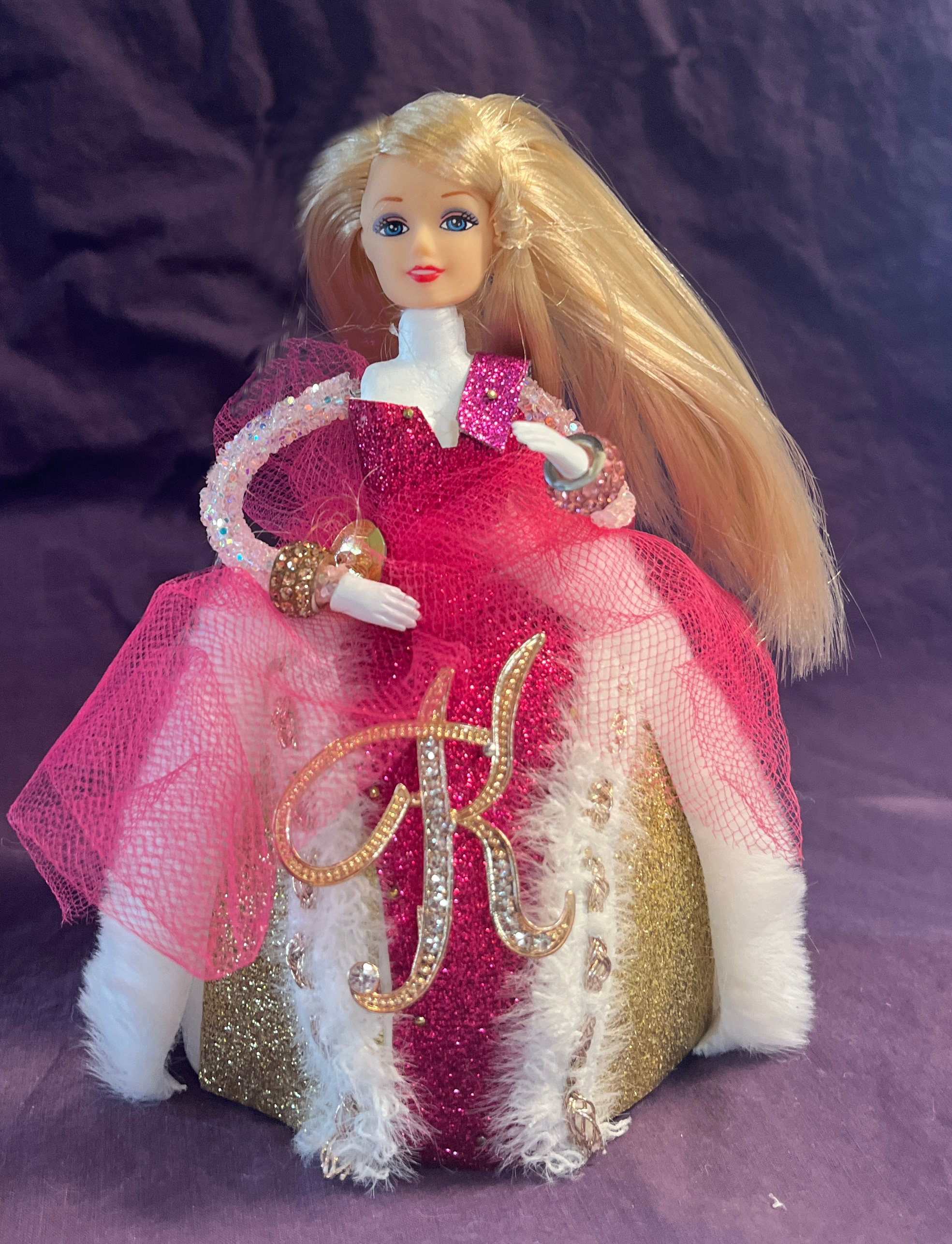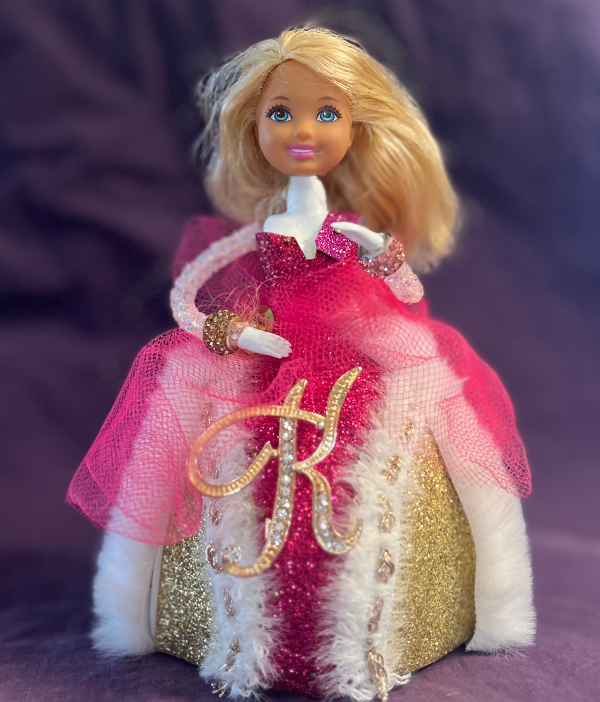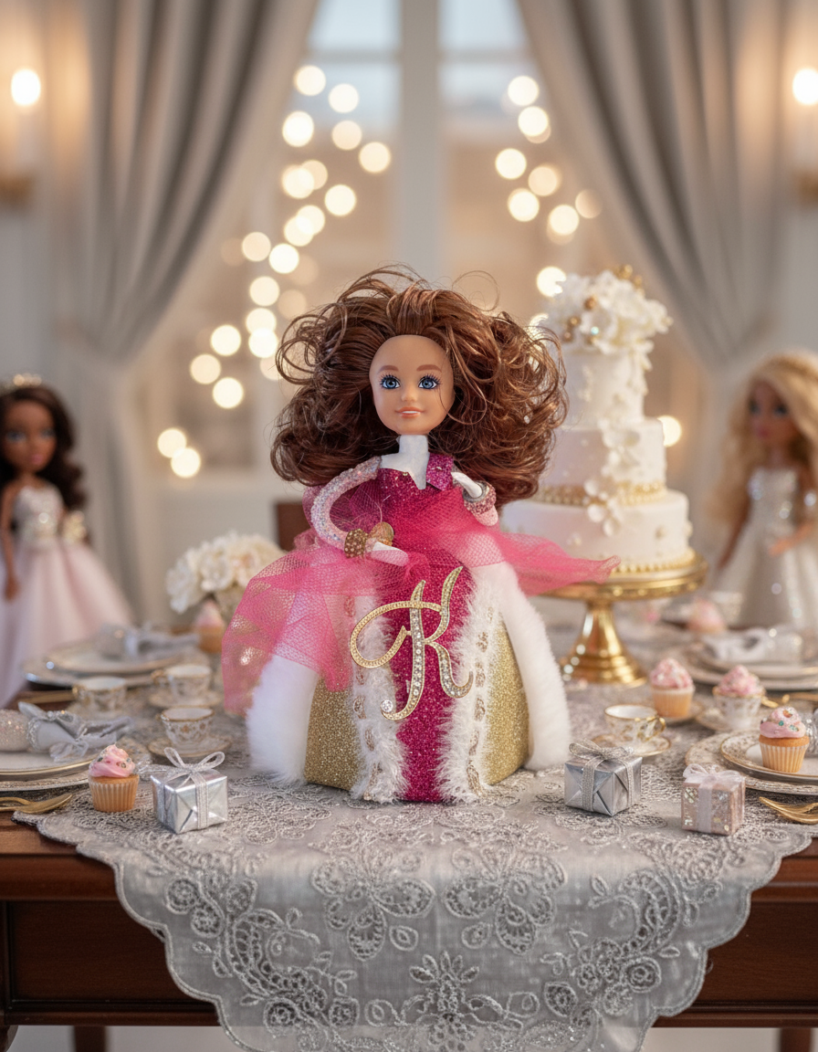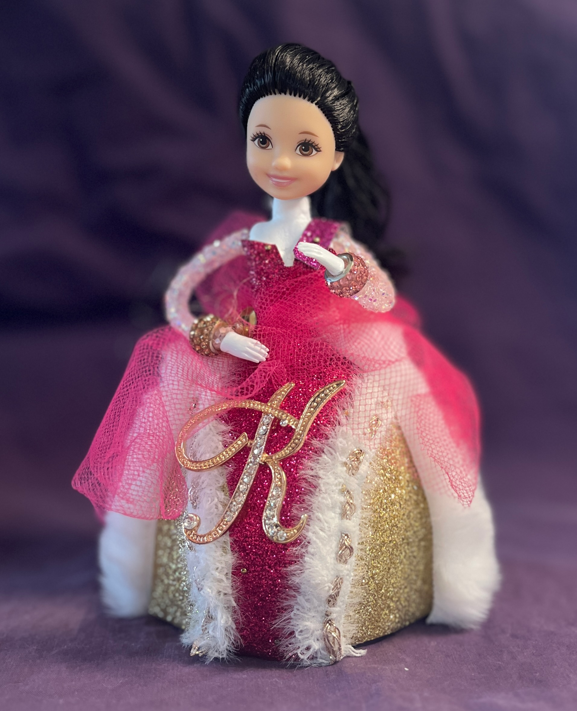 Karina’s outfit is a blend of sophistication and modern flair. She wears a chic, layered skirt made from premium fabrics that shimmer in light pastel tones. The soft, flowing material is accented with delicate sequins and beads, creating a dazzling yet understated look. Her fitted bodice is highlighted with intricate lace detailing, giving her a touch of classic elegance. Customize her with the Monogram of your choice. Pick any letter.