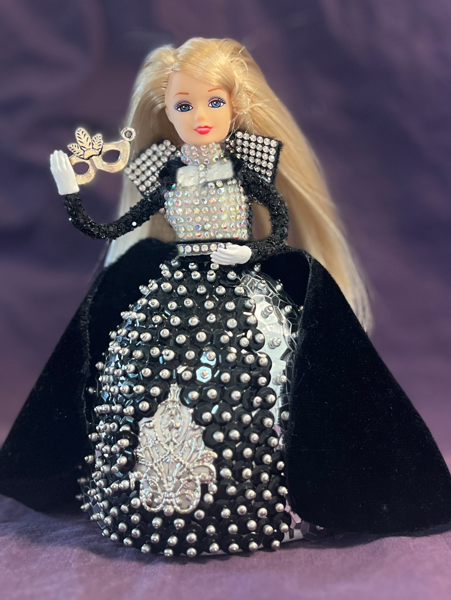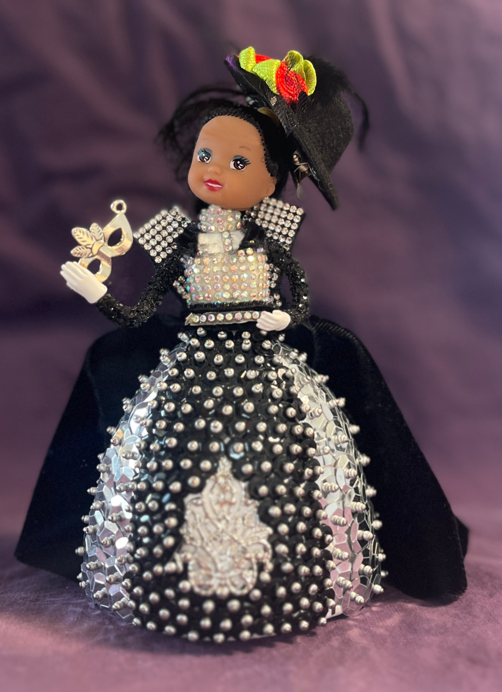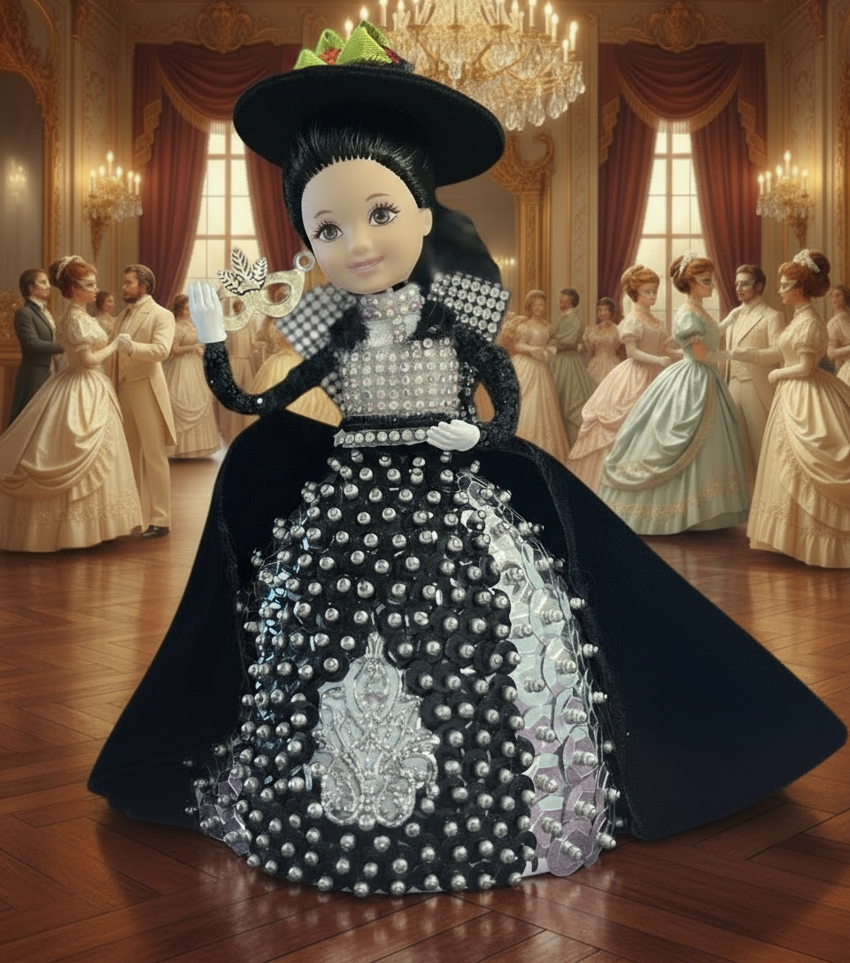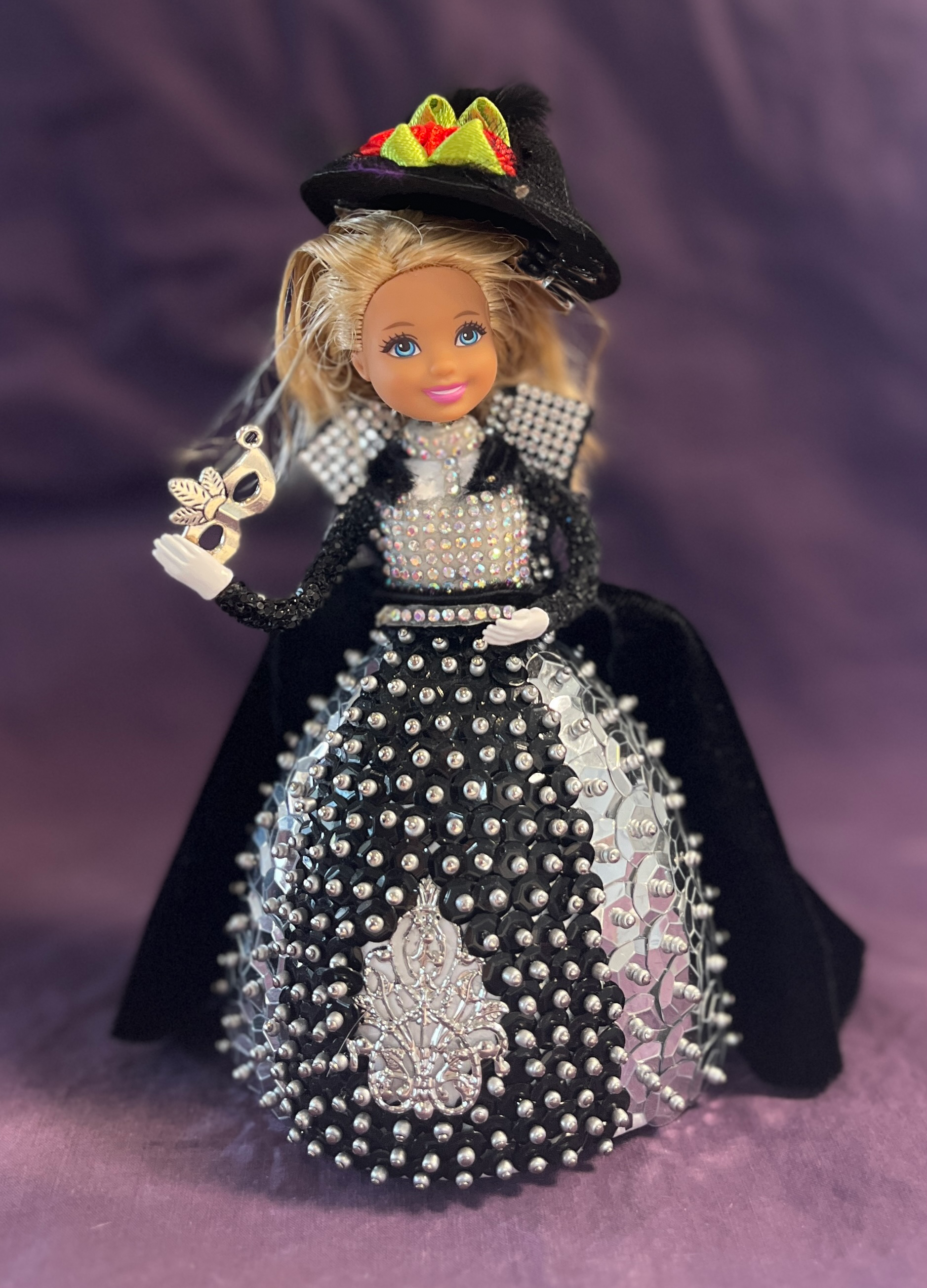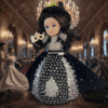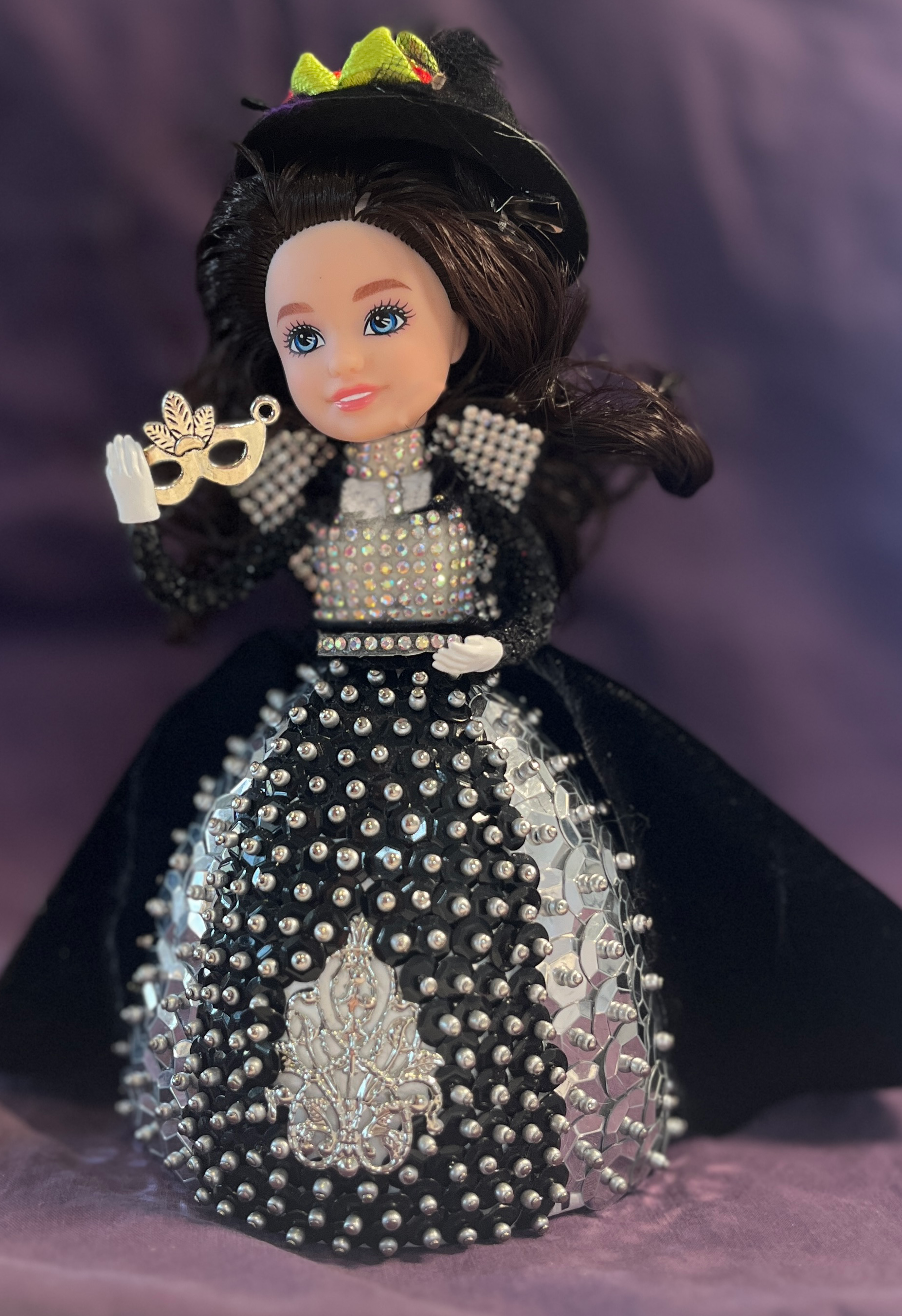 Raven makes an unforgettable entrance in a sleek black ball gown adorned with shimmering silver accents. Her look is completed by a luxurious black velvet cape with a dramatic rhinestone-raised collar, perfect for creating a bold, mysterious silhouette. Add her chic black hat, featuring a delicate veil held by silver rhinestones, and Raven is the epitome of gothic glam—equal parts Morticia Addams and runway couture.
