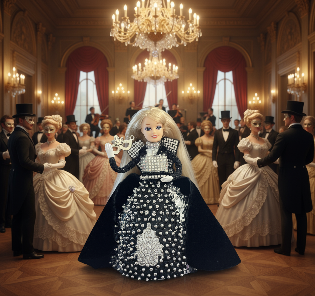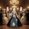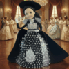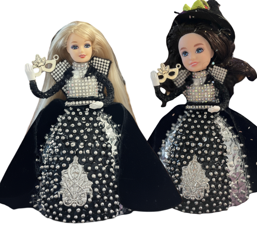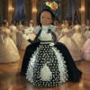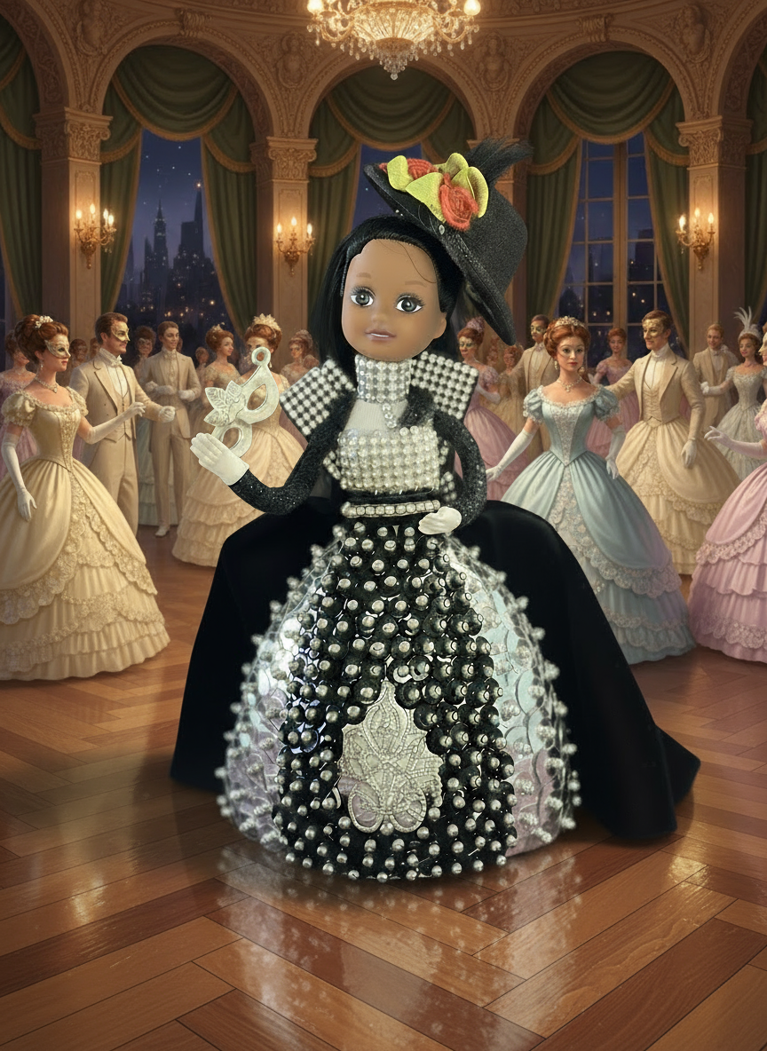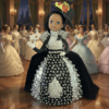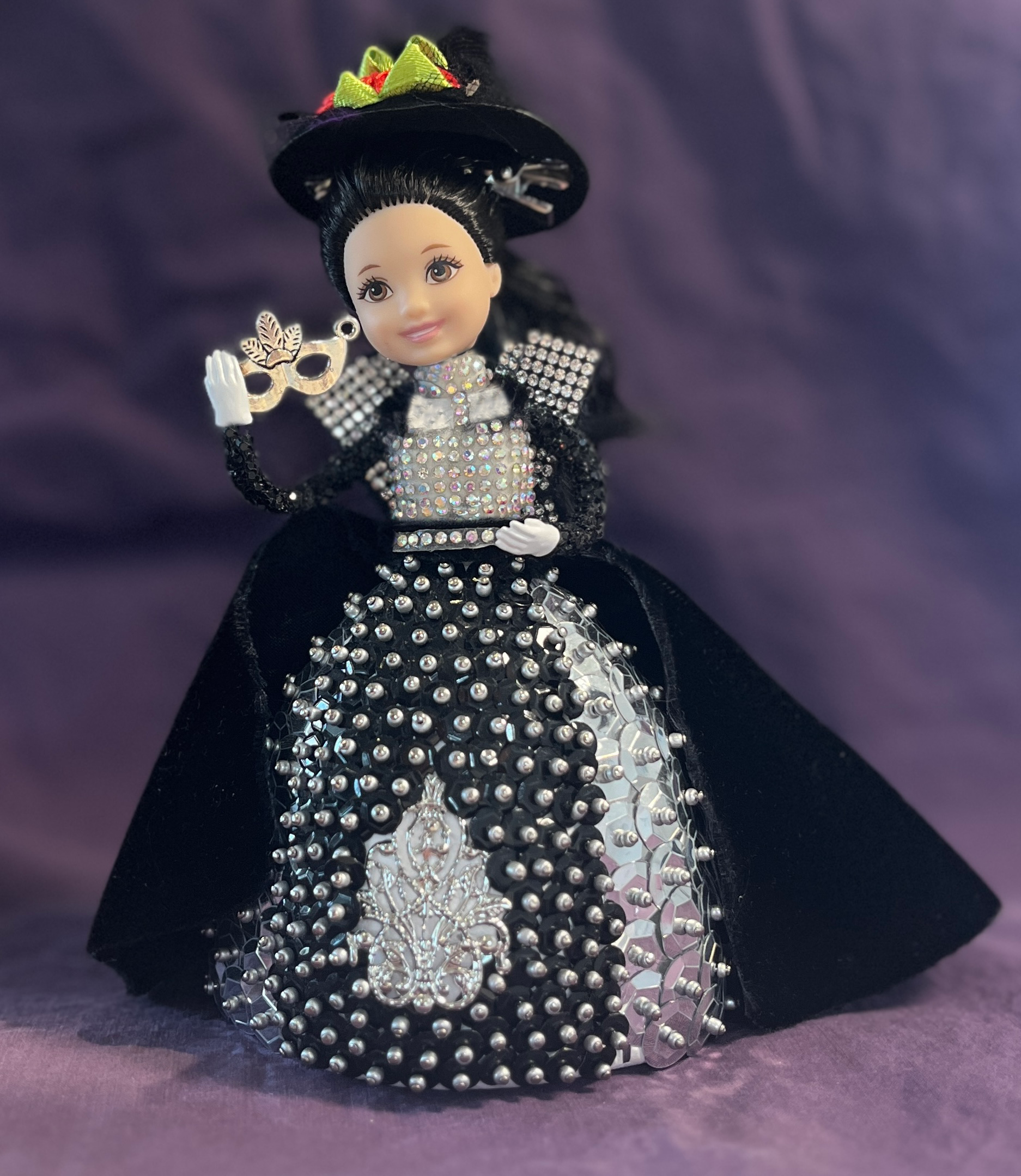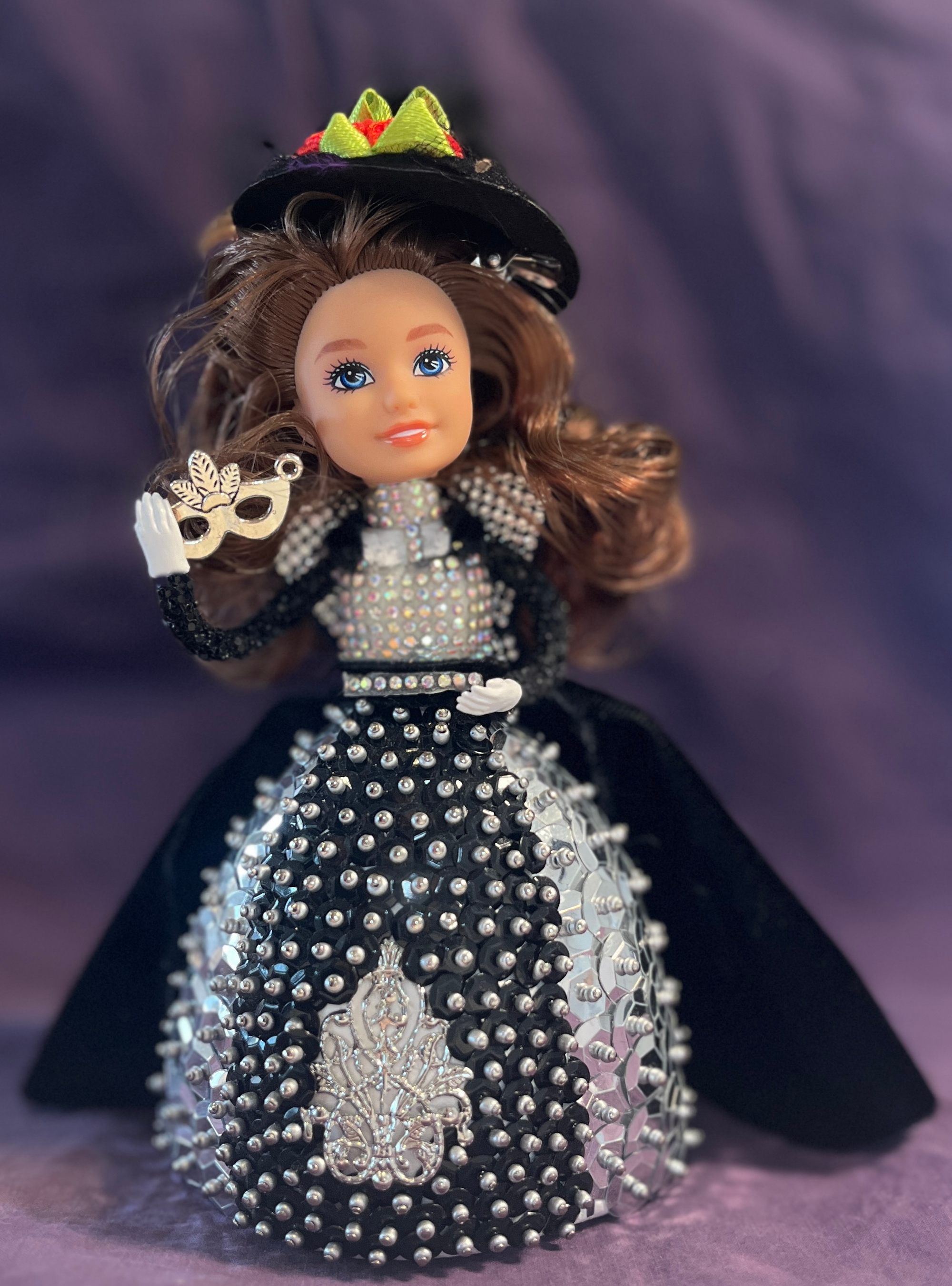 Raven makes an unforgettable entrance in a sleek black ball gown adorned with shimmering silver accents. Her look is completed by a luxurious black velvet cape with a dramatic rhinestone-raised collar, perfect for creating a bold, mysterious silhouette. Add her chic black hat, featuring a delicate veil held by silver rhinestones, and Raven is the epitome of gothic glam—equal parts Morticia Addams and runway couture.
